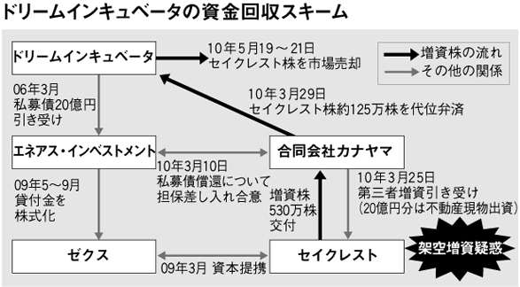 こうして順を追うと、架空増資の引き金はエネアス社の私募債償還問題だったようにも見えてくる。ドリームインキュベータはおそらく善意の第三者を主張するのだろうが、怪しげな増資株を見ず知らずの会社から受け取る経営姿勢はコンプライアンス上、大いに問題があると言わざるを得ない。すでに当時、セイクレストやゼクスを巡る不透明な株式操作は一部で報じられていたからなおさらだ。