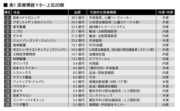 表1には、医療機器マネー上位20傑の企業を掲載した。上位企業が販売する医療機器としては、心疾患や手術器具などが目立つ。例えばトップの日本メドトロニック社は、かねてより心臓ペースメーカー販売の世界最大手であったが、15年には、手術器具の製造販売に強みを持つアイルランドのコヴィディエン社を買収した。その結果、心疾患関連医療機器と手術器具と、ドル箱の医療機器を複数抱え、特に支払いが増えている。一方で内資では、ニプロやテルモ、オリンパスといった企業が多くのカネを支払っていた。
