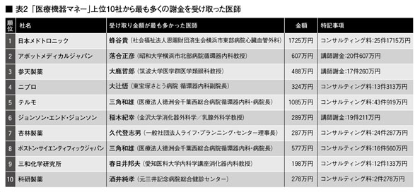 表2には、医療機器マネー上位10社について、謝金の支払いが最も多かった医療者をまとめた。まず個人への謝金における特徴として、コンサルティング料が多いことが挙げられる。これは、講演会での営業活動を主戦場とする製薬マネーと対照的である。コンサルティング料は、講師謝金や原稿執筆・監督料に比較して、労務の詳細が不明瞭であることが多く、製薬マネーでもしばしば問題になっている。それにしても、コンサルティング料が目立つのは、“見えないカネ”が問題になる医療機器マネーらしい。実際、日本メドトロニックから蜂谷貴氏(社会福祉法人恩賜財団済生会横浜市東部病院心臓血管外科)に支払われたコンサルティング料(1件あたり平均68万円)に顕著なように、1件あたりの金額も極めて高額である。一方で、三角和雄氏(医療法人徳洲会千葉西総合病院循環器内科・病院長)は、テルモ、ボストン・サイエンティフィックジャパンから最多の支払いを受け取っていた。一部の医師に支払いが集中するのは、製薬マネーと共通する特徴であろう。
