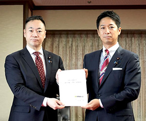 鈴木法相(左)に政策提言を行う藤田共同代表(9月19日、維新の会HPより)