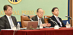 日本記者クラブで会見する「未来を創る財団」の國松氏(中央)と筆者(左)