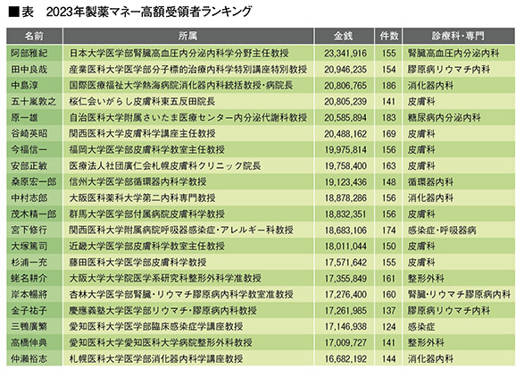 前号の記事では、医療機器業界におけるコンプライアンスの低さに加え、当該准教授の上司であり東京大学病院院長でもある田中栄医師が、講演会などを通じて製薬企業等から繰り返し謝金を受け取っていた事例を取り上げた。その上で、指導的立場にある医師ほど企業との関係が強まりやすいという医療界の構造と、それが事件の遠因となった可能性を指摘した。では、最新データである2023年時点において、指導層にある医師は実際にどの程度の謝金を受け取っていたか。